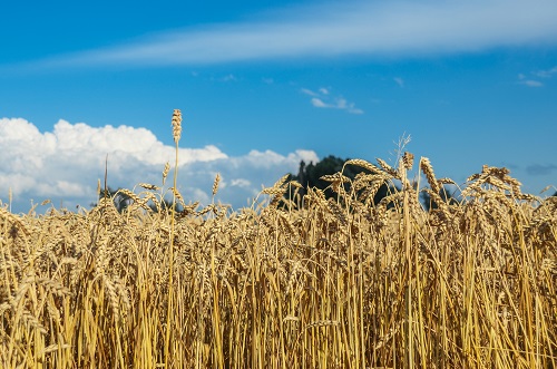 Golden wheat field with blue sky and clouds in background