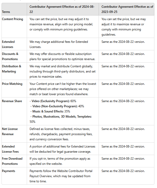 The new video price tiers will be implemented across all currencies on Pond5, and the Contributor Agreement will be updated effective August 22, 2024. A copy of the new Contributor Agreement can be found here.
